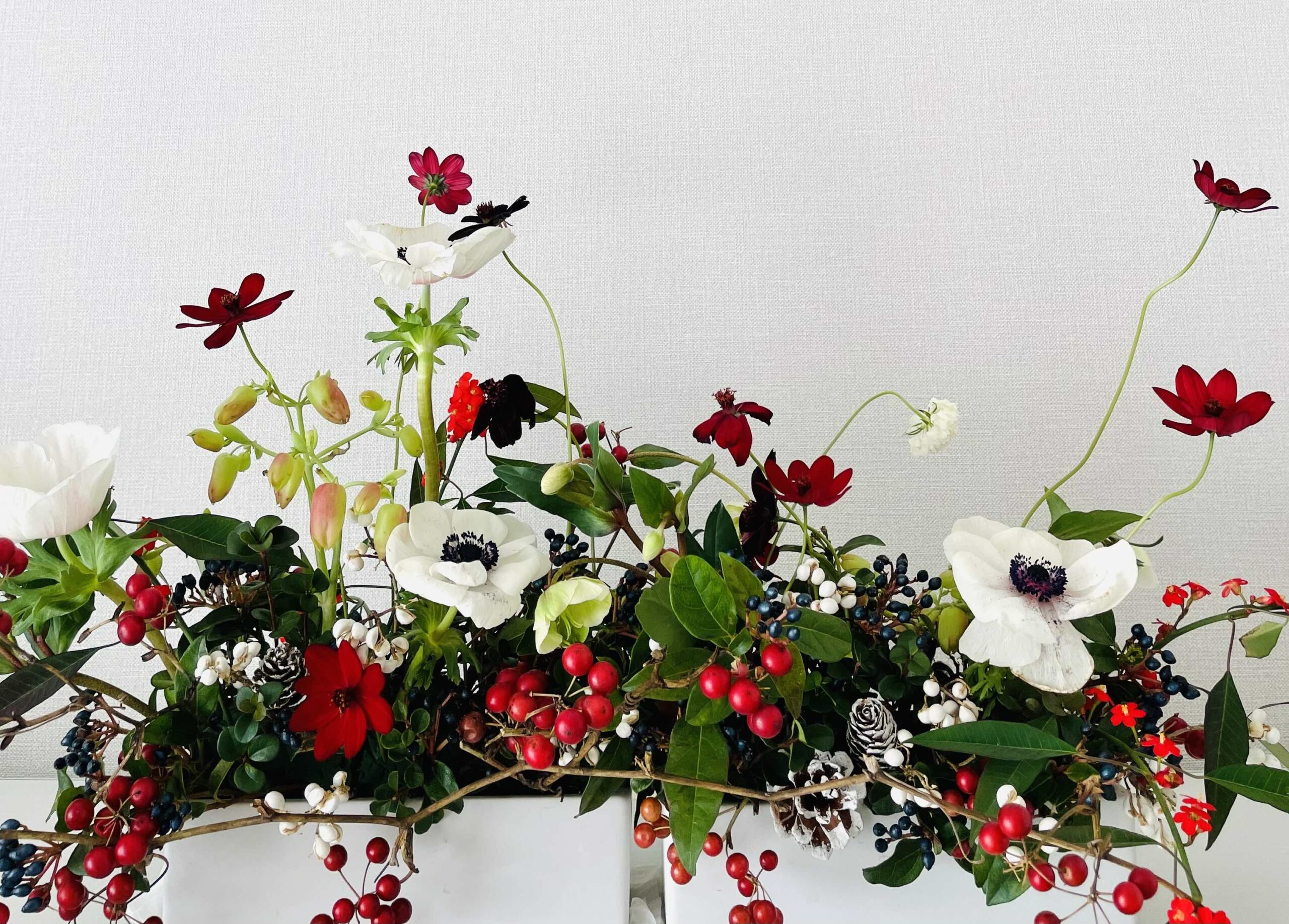 今年はクリスマスからお正月まで繋がるようなイメージで、と近所の花屋さんにフラワーアレンジを頼んでいました。